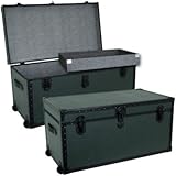 Equipped with two sturdy wheels, the Garrison Trunk - Olive Green is easy to take with you wherever you go. Constructed with durable wood and heavy-gauge vinyl, this olive green trunk features black tacked binding and black hardware for a sturdy yet attractive storage solution. Contents are protected by the paper-lined interior, which is simple to access with the push-button key lock. Roll this storage trunk along with the two recessed wheels or carry it by the two black side handles. It comes with a handy 3.5-inch deep removable tray - perfect for storing jewelry, makeup, and other small items. About Mercury Luggage Manufacturing Co. Founded in 1946, Mercury Luggage Manufacturing Co. is a privately owned corporation headquartered in Jacksonville, Florida with a domestic warehouse and manufacturing space exceeding 300,000 square feet. In 1998 Mercury acquired Petersburg, Virginia based Seward Trunk Co., which has been providing customers with the best trunks in the industry for over 130 years. Seward trunks are skillfully crafted in America in a variety of designs and materials. Today, the partnership of Mercury and Seward has established itself as the premier supplier of high quality luggage, sports bags, and custom trunks and case. Heavy-gauge vinyl on sturdy wood construction. Olive green exterior, black tacked binding, black hardware. Paper-lined interior, tray included. 2 handles, 2 recessed wheels for easy transport. Made in the U.S.A.. Dimensions: 31L x 16.5W x 15.25H inches.